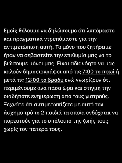 Εμείς θέλουμε να δηλώσουμε ότι λυπόμαστε και πραγματικά ντρεπόμαστε για την αντιμετώπιση αυτή. Το μόνο που ζητήσαμε ήταν να σεβαστείτε την επιθυμία μας να το βιώσουμε μόνοι μας. Είναι αδιανόητο να μας καλούν δημοσιογράφο από τις 07:00 το πρωί ή μετά τις 12:00 το βράδυ ενώ γνωρίζουν ότι περιμένουμε οιαδήποτε ενημέρωση από τους γιατρούς. Ξεχνάτε ότι αντιμετωπίζετε με αυτό τον τρόπο 2 παιδιά τα οποία ενδέχεται να πορευτούν για το υπόλοιπο της ζωής τους χωρίς τον πατέρα τους.