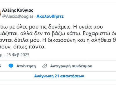 «Παλεύω με όλες μου τις δυνάμεις. Η υγεία μου δοκιμάζεται, αλλά δεν το βάζω κάτω. Ευχαριστώ όσους στέκονται δίπλα μου. Η δικαιοσύνη και η αλήθεια θα νικήσουν, όπως πάντα» υποτίθεται ότι είχε γράψει ο Αλέξης Κούγιας, με τους δικούς του ανθρώπους να διευκρινίζουν ότι ο 75χρονος ποινικολόγος δεν έχει social media.