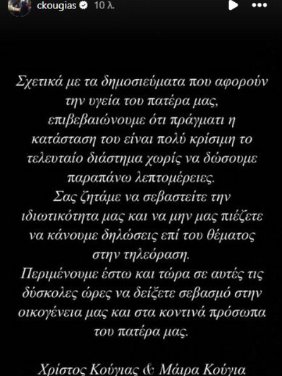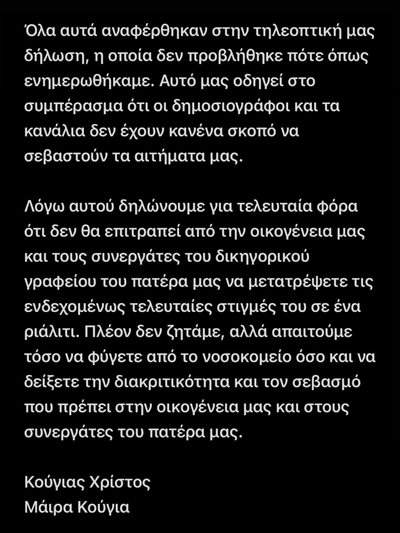Στο μεταξύ, το βράδυ της Τρίτης με ένα σπαρακτικό μήνυμα στα social media, ο Χρίστος και η Μάιρα Κούγια έκαναν έκκληση στους δημοσιογράφους για σεβασμό επισημαίνοντας πως «αντιμετωπίζετε με άσχημο τρόπο δύο παιδιά τα οποία ενδέχεται να πορευτούν χωρίς τον πατέρα τους».