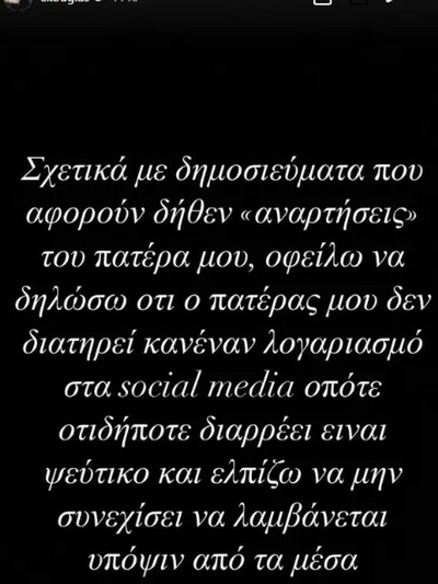 Στην ανάρτησή του, ο Χρίστος Κούγιας ανέφερε: «Σχετικά με τα δημοσιεύματα που αφορούν δήθεν αναρτήσεις του πατέρα μου, οφείλω να δηλώσω ότι ο πατέρας μου δεν διατηρεί κανέναν λογαριασμό στα social media, οπότε οτιδήποτε διαρρέει είναι ψεύτικο. Ελπίζω να μη συνεχίσει να λαμβάνεται υπόψη από τα Μέσα».