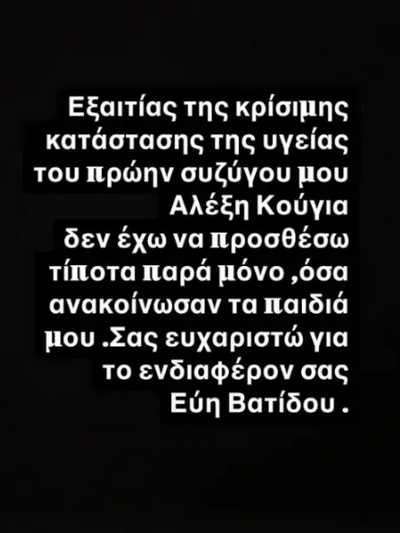 Λίγη ώρα αργότερα και η πρώην σύζυγος του Εύη Βατίδου προχώρησε σε μια ανάρτηση συντασσόμενη με τα παιδιά της σε αυτό το τόσο σοβαρό θέμα που αφορά την οικογένεια τους, στην οποία αναφέρει: «Εξαιτίας της κρίσιμης κατάστασης της υγείας του πρώην συζύγου μου, Αλέξη Κούγια, δεν έχω να προσθέσω τίποτα, παρά μόνο όσα ανακοίνωσαν τα παιδιά μου. Σας ευχαριστώ για το ενδιαφέρον σας».