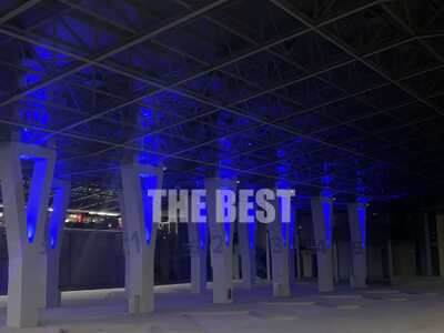 Μάλιστα, στο εσωτεικό μέρος του κτιρίου οι κολώνες είναι φωτισμένες με έντονο μπλε χρώμα δίνοντας εντυπωσιακό θέαμα σε σχέση με την ανάδειξη της ιδιαιτερότητας του κτιρίου.
