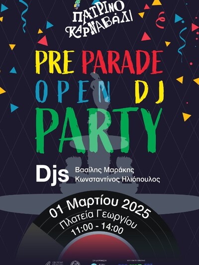 Το «PRE PARADE OPEN DJ PARTY», που συνδιοργανώνoυν η ΚΕΔΗΠ-Καρναβάλι Πάτρας με την Περιφέρεια Δυτικής Ελλάδος, θα πραγματοποιηθεί το Σάββατο 1η Μαρτίου 2025, από τις 11 το πρωϊ έως τις 2 το μεσημέρι στην πλατεία Γεωργίου Α΄, την ώρα που θα διεξάγεται ο σοκολατοπόλεμος με σοκολατορίψεις από οχήματα που θα παρελάσουν στους κεντρικούς δρόμους της πόλης.