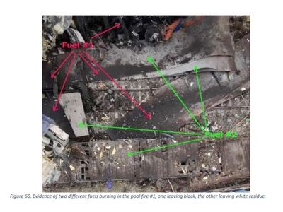 Στη σελίδα 104 του πορίσματος του ΕΟΔΑΣΑΑΜ γίνεται αναφορά στα καύσιμα που βρέθηκαν στο σημείο της τραγωδίας. Συγκεκριμένα, στην παράγραφο 474, το πόρισμα τονίζει πως «Το γεγονός ότι η φωτιά έχει αφήσει δύο διαφορετικά υπολείμματα είναι μια άμεση ένδειξη ότι δύο διαφορετικά καύσιμα φαίνεται να εμπλέκονται στο συμβάν»: