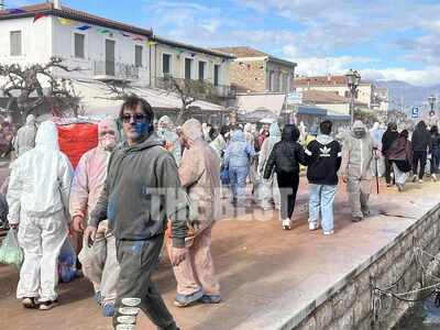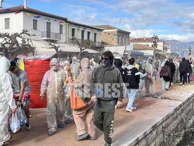 Το έθιμο με τα αλευρομουτζουρώματα στο Γαλαξίδι αναβίωσε για μία ακόμη χρονιά. Ο λεγόμενος αλευρομουτζουρωμένος γάμος ξεκινάει από το κέντρο της πόλης με εκατοντάδες καρναβαλιστές, οι οποίοι έχουν ετοιμαστεί για την «μάχη» με το αλεύρι.