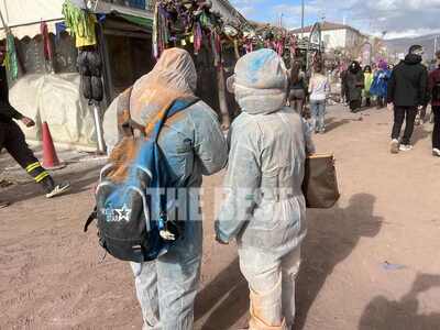 Πολλοί φορούν προστατευτικά και μάσκες. Μόλις η «πορεία» του γάμου ξεκινήσει οι περαστικοί πετούν αλεύρι. Μόλις η γαμήλια πομπή φτάσει στο λιμάνι τότε ξεκινάει ο «πόλεμος» με το αλεύρι που κρατάει για ώρες εν μέσω χορού και μουσικής.