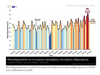 Η μέση θερμοκρασία στην Ελλάδα από το 1960 μέχρι και το 2025 για την περίοδο του χειμώνα παρουσιάζει άνοδο κατά 1.8 °C.