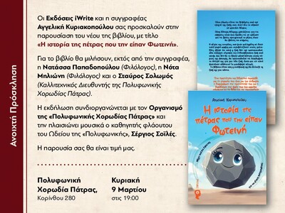 Οι εκδόσεις iwrite και η συγγραφέας Αγγελική Κυριακοπούλου σας προσκαλούν στην παρουσίαση του νέου της βιβλίου, με τίτλο «η ιστορία της πέτρας που την είπαν Φωτεινή».