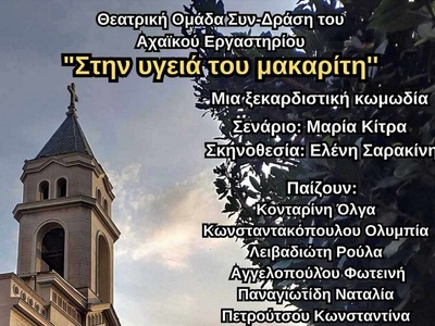 Το Αχαϊκό Εργαστήρι Πολιτισμού & Παράδοσης και η θεατρική του ομάδα «Συν-Δράση», σε συνεργασία με την Περιφέρεια Δυτικής Ελλάδας, παρουσιάζουν την παράσταση με τίτλο «Στην υγειά του μακαρίτη» την Παρασκευή 7 Μαρτίου 2025, στις 9:30 μ.μ., στο θέατρο Act στις σκάλες Γεροκωστοπούλου, στην Πάτρα.
