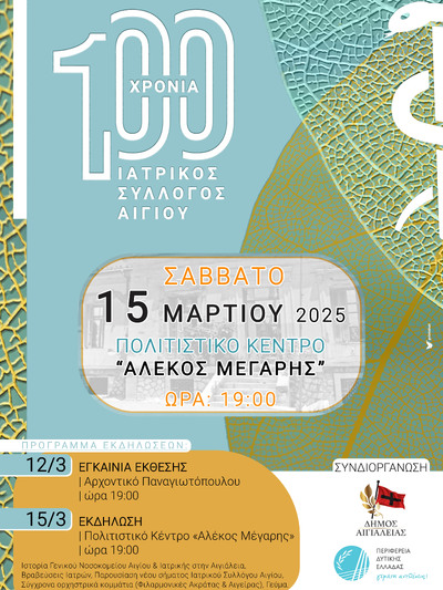 Ο Ιατρικός Σύλλογος Αιγίου, προσκαλεί όλους τους πολίτες στις επετειακές εκδηλώσεις για τη συμπλήρωση 100 χρόνων λειτουργίας του.