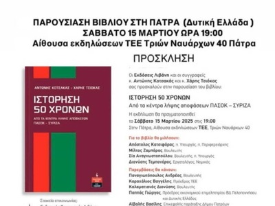 Η παρουσίαση του βιβλίου των Αντώνη Κοτσακά και Χάρη Τσιόκα “Ιστόρηση 50 χρόνων από τα κέντρα λήψης αποφάσεων Πασοκ και Συριζα” θα πραγματοποιηθεί στις 15 Μαρτίου, στην Πάτρα, στην αίθουσα του ΤΕΕ, στις 7μμ..
