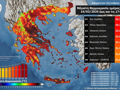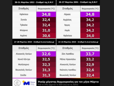 Όπως αναφέρει το meteo.gr, η υψηλότερη μέγιστη θερμοκρασία την Κυριακή καταγράφηκε στο μετεωρολογικό σταθμό στο Σίσι Λασιθίου και ήταν ίση με 33,7 βαθμούς Κελσίου, όπου αποτελεί και νέο ρεκόρ για τον μήνα Μάρτιο.