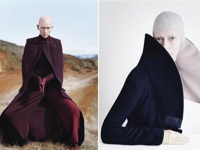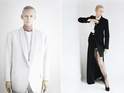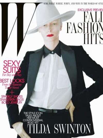 Η Tilda Swinton φοράει σμόκιν και μεταξωτό πουκάμισο από τον Salvatore Ferragamo στο εξώφυλλο του τεύχος Αυγούστου του περιοδικού «W». Το παντελόνι είναι Acne, καπέλο Patricia Underwood for Chris Benz και γάντια Sermoneta.