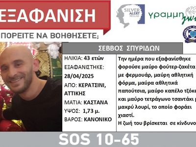 Η «Γραμμή Ζωής» απευθύνει έκκληση σε όποιον γνωρίζει οτιδήποτε σχετικά με τον κ. Σέββο να επικοινωνήσει άμεσα, όλο το 24ωρο, με την Εθνική Γραμμή SOS 1065.