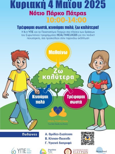 Η 6η ΥΠΕ και το πανεπιστήμιο Πατρών στο πλαίσιο των συνεχιζόμενων δράσεων του Ευρωπαϊκού προγράμματος HEALTH4EUKIDS για την παιδική παχυσαρκία, προσκαλούν στην εκδήλωση "Τρέφομαι σωστά, κινούμαι πολύ, ζω καλύτερα!" την Κυριακή 4 Μαΐου 2025, 10.00-14.00μ.μ. στο Νότιο Πάρκο Πάτρας