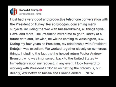 Ο Ντόναλντ Τραμπ δήλωσε ότι είχε μια παραγωγική τηλεφωνική συνομιλία με τον Τούρκο πρόεδρο Ταγίπ Ερντογάν, κατά την οποία συζήτησαν θέματα όπως ο πόλεμος στην Ουκρανία, αλλά και ζητήματα που αφορούν τη Συρία και τη Γάζα.