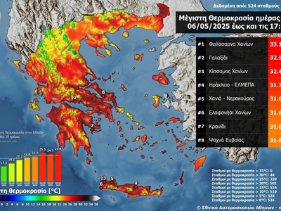 Ξεπέρασε τους 33°C η θερμοκρασία την Τρίτη (6/5) με τη μέγιστη τιμή να καταγράφεται από τον μετεωρολογικό σταθμό στα Φαλάσαρνα (33.1°C) και ακολούθησαν αυτοί του Γαλαξιδίου (32.5°C) και του Κισσάμου Χανίων (32.4 °C). Στον χάρτη της εικόνας που ακολουθεί παρουσιάζεται η κατανομή της μέγιστης θερμοκρασίας στη χώρα σύμφωνα με το δίκτυο αυτόματων μετεωρολογικών σταθμών του Εθνικού Αστεροσκοπείου Αθηνών / meteo.gr.