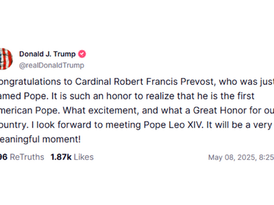 «Συγχαρητήρια στον καρδινάλιο Ρόμπερτ Φράνσις Πρέβοστ, ο οποίος μόλις ορίστηκε Πάπας. Είναι μεγάλη τιμή να συνειδητοποιούμε ότι είναι ο πρώτος Αμερικανός Πάπας. Τι συγκίνηση και τι μεγάλη τιμή για τη χώρα μας. Ανυπομονώ να συναντήσω τον Πάπα Λέοντα XIV. Θα είναι μια πολύ σημαντική στιγμή!», έγραψε ο Αμερικανός πρόεδρος σε ανάρτησή του στην πλατφόρμα Truth Social.