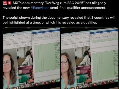 Κατά τη διάρκεια του ντοκιμαντέρ «Der Weg zum ESC 2025», ο ελβετικός ραδιοτηλεοπτικός φορέας φέρεται να αποκάλυψε τη νέα μορφή ανακοίνωσης των προκριματικών χωρών των ημιτελικών της Eurovision 2025. Όπως αναφέρει το ESC Discord, το σενάριο που προβλήθηκε κατά τη διάρκεια του ντοκιμαντέρ αποκαλύπτει ότι τρεις χώρες θα επισημαίνονται κάθε φορά, με μία από αυτές να ανακοινώνεται ως προκριματική.