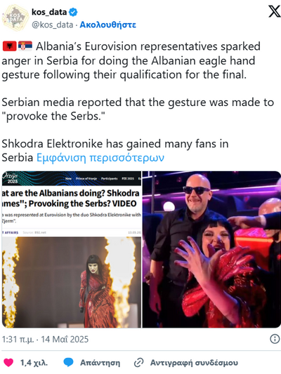 Θύελλα αντιδράσεων έχει προκαλέσει στη Σερβία, η κίνηση της εκπροσώπου της Αλβανίας, στον Α' Ημιτελικό της Eurovision 2025.
