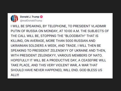 «Θα μιλήσω τηλεφωνικά με τον πρόεδρο της Ρωσίας Βλαντιμιρ Πούτιν, την Δευτέρας. Τα αντικείμενα της συνομιλίας θα είναι να σταματήσει το “λουτρό αίματος”, καθώς σκοτώνονται κατά μέσο όρο περισσότερους από 5.000 Ρώσους και Ουκρανούς στρατιώτες την εβδομάδα και το εμπόριο» αναφέρει χαρακτηριστικά ο πρόεδρος των ΗΠΑ στην ανάρτησή του.