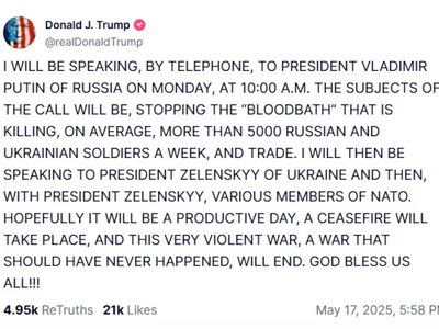 Στην ανάρτησή του στο Truht Social ο πρόεδρος των ΗΠΑ εξέφρασε την ελπίδα ότι η σημερινή ημέρα θα είναι «παραγωγική» και θα καταλήξει με ανακοίνωση για εκεχειρία ώστε «αυτός ο πολύ βίαιος πόλεμος, ένας πόλεμος που δεν θα έπρεπε να έχει συμβεί, να σταματήσει».