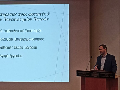 Την εκδήλωση χαιρέτισαν ο Καθηγητής Χρήστος Μπούρας, Πρύτανης του Πανεπιστημίου Πατρών και ο Καθηγητής Ιωάννης Βενέτης, Αντιπρύτανης Ακαδημαϊκών Θεμάτων & Οικονομικών του Πανεπιστημίου Πατρών. Άκρως ενδιαφέρουσες ομιλίες έδωσαν οι κ.κ. Μάχη Γεωργακοπούλου, μέλος του Συμβουλίου Διοίκησης του Πανεπιστημίου Πατρών, Θεόδωρος Λουλούδης, Πρόεδρος του Επιμελητηρίου Αχαΐας, Γεώργιος Παππάς, Πρόεδρος του ΟΕΕ (Παράρτημα Δυτ. Ελλάδας), και Φώτιος Βλάχος, Διευθυντής του Υποκαταστήματος της Τράπεζας της Ελλάδος στην Πάτρα.