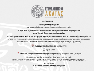 "Πέρα από τη Μάσκα: Ο Πολυσύνθετος Ρόλος του Πατρινού Καρναβαλιού στην Τοπική Οικονομία και Κοινωνία" είναι το θέμα της ημερίδας που διοργανώνει το Επιμελητήριο Αχαϊας , τη Δευτέρα 26 Μαΐου 2025 στην Αίθουσα Εκδηλώσεων Επιμελητηρίου Αχαΐας.