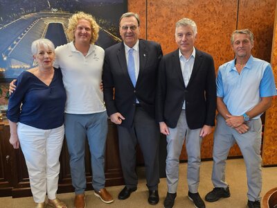 Ο Πρόεδρος της ΕΟΕ μαζί με τον Γενικό Γραμματέα και εκπρόσωπο του αθλήματος στην Ολομέλεια, Στέφανο Χανδακά, υποδέχθηκαν τον Κάμερον μαζί με τον πατέρα και προπονητή του Δημήτρη, καθώς και την Πρόεδρο της Ελληνικής Ιστιοπλοϊκής Ομοσπονδίας Νίκη Αναστασίου.