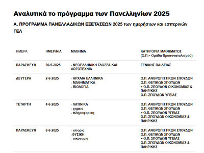 Οι φετινές Πανελλήνιες Εξετάσεις ξεκινούν για τα Γενικά Λύκεια την Παρασκευή 30 Μαΐου 2025, με το μάθημα της Νεοελληνικής Γλώσσας και Λογοτεχνίας, ενώ τη σκυτάλη παίρνουν οι μαθητές των Επαγγελματικών Λυκείων την επομένη, Σάββατο 31 Μαΐου 2025, με το μάθημα των Νέων Ελληνικών.