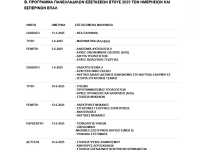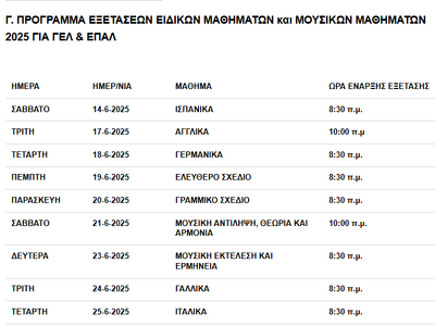 Οι εξετάσεις στα Ειδικά και Μουσικά Μαθήματα ξεκινά στις 14 Ιουνίου και ολοκληρώνονται στις 25 Ιουνίου.