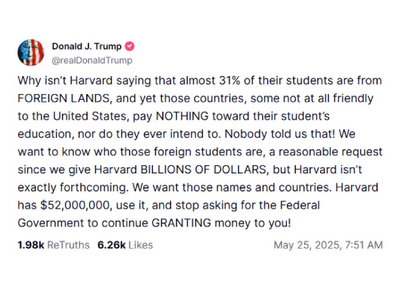 «Γιατί το Χάρβαρντ δεν λέει ότι σχεδόν 31% των φοιτητών του έρχονται από ΞΕΝΕΣ ΧΩΡΕΣ, και εντούτοις αυτές οι χώρες, μερικές από τις οποίες δεν είναι καθόλου φιλικές έναντι των Ηνωμένων Πολιτειών, δεν πληρώνουν ΤΙΠΟΤΑ για την εκπαίδευση των φοιτητών τους ούτε έχουν την πρόθεση να το κάνουν», έγραψε ο Τραμπ στην πλατφόρμα Truth Social, της οποίας είναι ιδιοκτήτης.