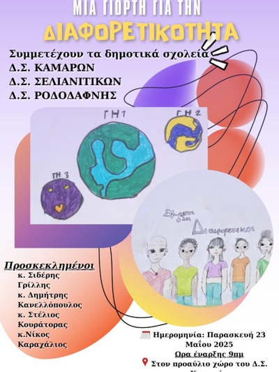 Με σύνθημα τη συμπερίληψη και τον σεβασμό στη μοναδικότητα κάθε ανθρώπου, πραγματοποιήθηκε την Παρασκευή 23 Μαΐου 2025, στον προαύλιο χώρο του Δημοτικού Σχολείου Καμαρών, κοινή εκδήλωση των Δημοτικών Σχολείων Καμαρών, Σελιανιτίκων και Ροδοδάφνης με θέμα τη διαφορετικότητα.
