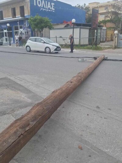 Συγκεκριμένα, στην περιοχή του Κλαδισού, επί της Παλιάς Εθνικής Οδού στο ρεύμα προς Χανιά, δυο στύλοι της ΔΕΗ έπεσαν από τους ισχυρούς ανέμους. Στο σημείο μετέβη η τροχαία για ρύθμιση της κυκλοφορίας ώστε να διασφαλιστεί η ασφάλεια των πολιτών. Προσωρινά, για λίγη ώρα, είχε γίνει διακοπή της κυκλοφορίας.