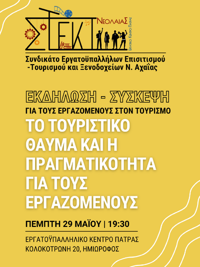 Το Συνδικάτο Εργατοϋπαλλήλων Επισιτισμού - Τουρισμού και Ξενοδοχείων Ν. Αχαΐας και το Στέκι Νεολαίας του Εργατοϋπαλληλικού Κέντρου Πάτρας διοργανώνει εκδήλωση-συζήτηση με θέμα: «Το τουριστικό θαύμα και η πραγματικότητα για τους εργαζόμενους».