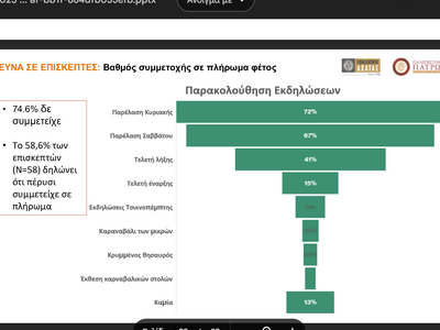 * Αναφορικά με τις εκδηλώσεις που συμμετέχουν, φαίνεται ότι στο φετινό καρναβάλι επιλέγουν πρωτίστως τη «Βραδινή ποδαράτη- Παρέλαση Σαββάτου» (100%), την «Παρέλαση Κυριακής» (100%).