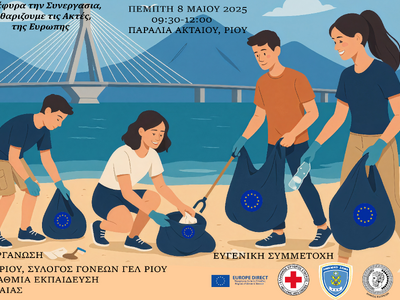 Με αφορμή την Ημέρα της Ευρώπης, την Πέμπτη 8 Μαΐου 2025 πραγματοποιήθηκε δράση καθαρισμού στην Παραλία Ακταίου Ρίου, υπό το σύνθημα «Με Γέφυρα τη Συνεργασία, Καθαρίζουμε τις Ακτές της Ευρώπης».