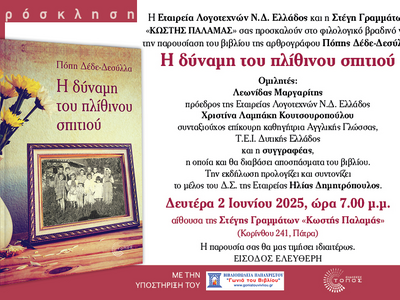 Το βιβλίο με τίτλο "Η δύναμη του πλίθινου σπιτιού" της Πόπης Δέδε-Δεσύλλα που η 1η έκδοση του είχε γίνει τον Απρίλιο 2023 πρόκειται να παρουσιαστεί στο πλαίσιο των Φιλολογικών Βραδινών της Εταιρείας Λογοτεχνών Νοτιοδυτικής Ελλάδος, την Δευτέρα 2 Ιουνίου 2025 στις 19.00 στην αίθουσα της Στέγης Γραμμάτων "Κωστής Παλαμάς" στην οδό Κορίνθου 241.