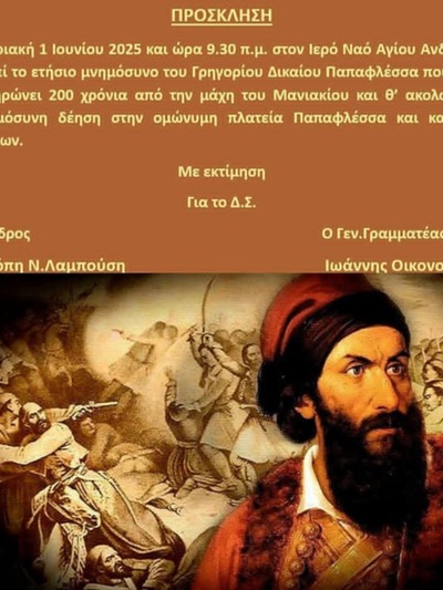 Την Κυριακή 1η Ιουνίου 2025 και ώρα 9.30 π.μ. στον Ιερό Ναό Αγίου Ανδρέα θα τελεστεί το ετήσιο μνημόσυνο του Γρηγορίου Δικαίου - Παπαφλέσσα με πρωτοβουλία όπως κάθε χρόνο του Παμμεσσηνιακού Συνδέσμου Πατρών «Ο Παπαφλέσσας».