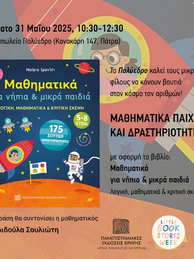 Στις εκπαιδευτικές δράσεις που οργανώνει το Πολύεδρο στην οδό Κανακάρη 147 στην Πάτρα, κάθε Σάββατο, αυτό το Σάββατο 31 Μαΐου 2025, 10:30 το πρωί με 12:30 το μεσημέρι, τα παιδιά θα δουλέψουν και θα παίξουν με έμπνευση το βιβλίο «Μαθηματικά για νήπια & μικρά παιδιά» του Ναόγια Ιµανίσι, που κυκλοφορεί από τις Πανεπιστημιακές Εκδόσεις Κρήτης.