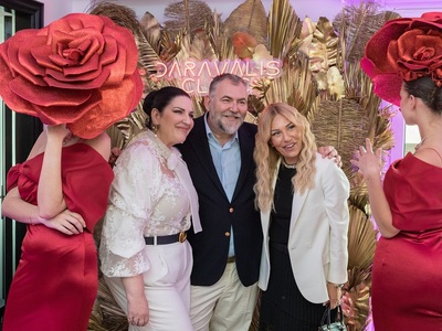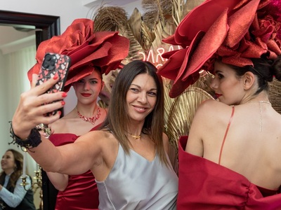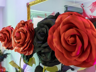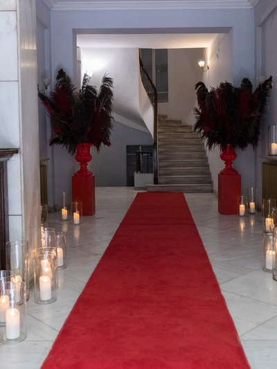 Η είσοδος του χώρου μετατράπηκε σε θεατρικό σκηνικό, με κόκκινο χαλί, εκατοντάδες αναμμένα κεριά και επιβλητικούς κόκκινους αμφορείς. Στο εσωτερικό, χειροποίητα τριαντάφυλλα και γυναικείες προτομές. Ξεχωριστή νότα έδωσαν οι καλλονές performers, ντυμένες σαν ζωντανά τριαντάφυλλα, που υποδέχονταν τους καλεσμένους και φωτογραφίζονταν μαζί τους.