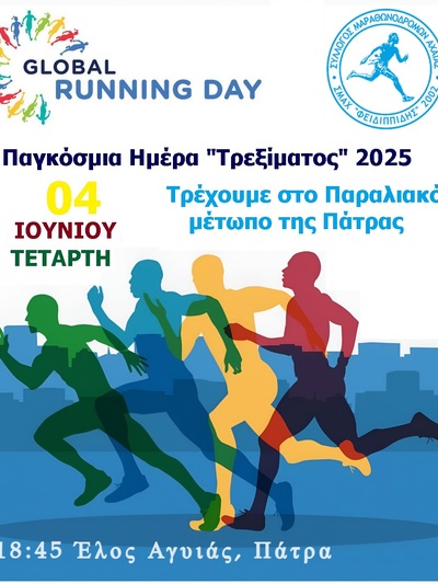 Ο Σύλλογος Μαραθωνοδρόμων Αχαΐας (Σ.Μ.ΑΧ.) «Φειδιππίδης», τιμώντας μαζί με εκατομμύρια δρομείς σε όλο τον κόσμο την «Παγκόσμια Ημέρα Τρεξίματος (Global Running Day)» για το 2025, που φέτος θα εορταστεί την Τετάρτη 4 Ιουνίου, προσκαλεί τα μέλη και τους φίλους δρομείς σε ομαδική προπόνηση που διοργανώνει ο Σύλλογος στο παραλιακό μέτωπο της Πάτρας.