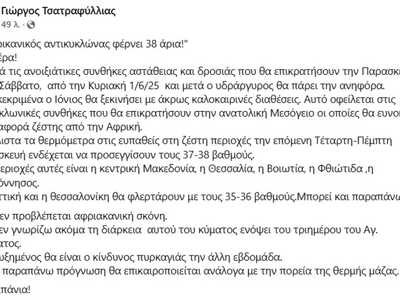 Στην ανάρτησή του για την αλλαγή του καιρού από την Κυριακή και μετά που «φέρνει 38αρια», ο μετεωρολόγος του Alpha αναφέρει ότι «ο Ιόνιος θα ξεκινήσει με άκρως καλοκαιρινές διαθέσεις. Αυτό οφείλεται στις αντικυκλωνικές συνθήκες που θα επικρατήσουν στην ανατολική Μεσόγειο οι οποίες θα ευνοήσουν τη μεταφορά ζέστης από την Αφρική».