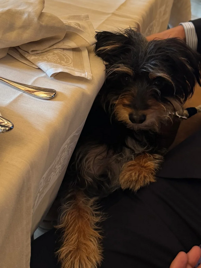 Ο Ελληνοαμερικανός και η Ιταλίδα ήταν κομψά ντυμένοι και πόζαραν χαμογελαστοί αγκαλιά με τον σκύλο τους.