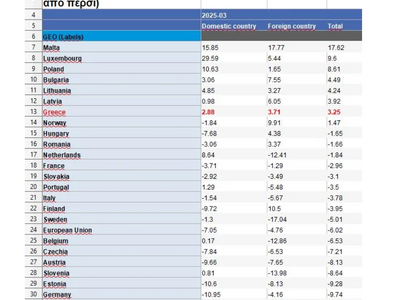 Σε αυτό το χρονικό διάστημα σημειώθηκε μικρή αύξηση των διανυκτερεύσεων των αλλοδαπών επισκεπτών (+1,1% σε σύγκριση με το πρώτο τρίμηνο του 2024), ενώ για τις διανυκτερεύσεις των ημεδαπών καταγράφηκε μικρή μείωση (-1,3%). Οι μεγαλύτερες αυξήσεις στις διανυκτερεύσεις ξένων επισκεπτών καταγράφηκαν στη Λετονία (+18,5%), στη Μάλτα (+17,2%) και στη Φινλανδία (+10,6%). Στο άλλο άκρο της κλίμακας, οι μεγαλύτερες μειώσεις ξένων επισκεπτών καταγράφηκαν στην Ιρλανδία (-23,1%), στην Κροατία (-16,7%) και στη Σουηδία (-11,5%).