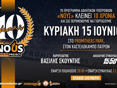 Το πρότυπο πρόγραμμα υποτροφιών αθλητών “NOUS” του Οργανισμού του Προμηθέα Πάτρας, έκλεισε τα 10 χρόνια λειτουργίας του και ο Προμηθέας θέλει να το γιορτάσουν όλοι μαζί στο Promitheas Park στον Καστελόκαμπο στην Πάτρα την Κυριακή 15 Ιουνίου.
