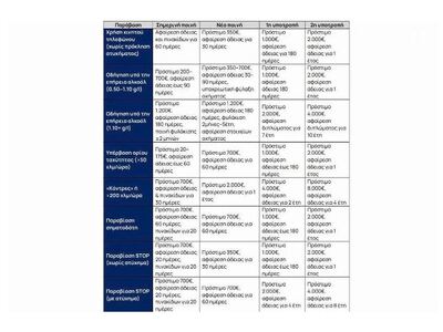 Στις παραβάσεις, για τις οποίες θα εφαρμόζονται κλιμακωτές ποινές περιλαμβάνονται η οδήγηση υπό την επήρεια αλκοόλ, η παραβίαση ερυθρού σηματοδότη ή STOP, η χρήση κινητού τηλεφώνου κατά την οδήγηση, η μεγάλη υπέρβαση του ορίου ταχύτητας, οι «κόντρες» και η οδήγηση μοτοσυκλέτας χωρίς κράνος.
