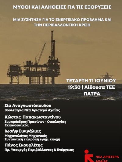 Η εκδήλωση που αναμένεται με ενδιαφέρον, έχει θέμα: "Μύθοι και Αλήθειες για τις εξορύξεις, μία συζήτηση για το ενεργειακό πρόβλημα και την περιβαλλοντική κρίση".