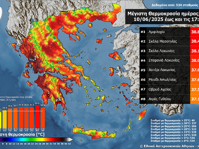 Σε υψηλά επίπεδα για την εποχή διατηρήθηκε η θερμοκρασία χθες Τρίτη 10/06/2025 κυρίως στη Δυτική Ελλάδα, με τις μέγιστες τιμές της να ξεπερνούν τοπικά τους 38 °C.