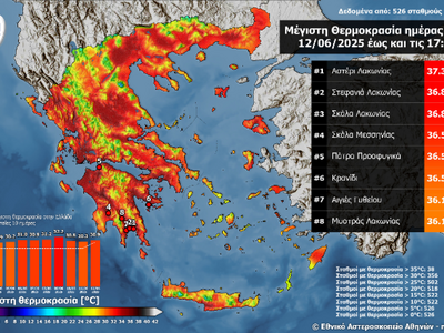 Σε υψηλά επίπεδα για την εποχή διατηρήθηκε η θερμοκρασία την Πέμπτη 12/06/2025 κυρίως στη Νότια Ελλάδα, με τις μέγιστες τιμές της να ξεπερνούν τοπικά τους 37 °C. Η υψηλότερη μέγιστη θερμοκρασία καταγράφηκε στο μετεωρολογικό σταθμό στο Αστέρι Λακωνίας και ήταν ίση με 37.3˚C. Όπως παρουσιάζεται στον παρακάτω χάρτη, σύμφωνα με το δίκτυο αυτόματων μετεωρολογικών σταθμών του Εθνικού Αστεροσκοπείου Αθηνών / meteo.gr, 38 μετεωρολογικοί σταθμοί του δικτύου κατέγραψαν μέγιστες θερμοκρασίες άνω των 35 °C.